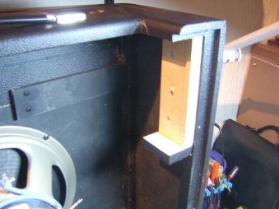 Aus 18 mm Sperrholz wurde dann die Aufnahme für das Chassis im Cabinet eingebaut. Diese Konstruktion war nötig, da ich ein Head- Chassis bestellt hatte und später die Combolösung vorgezogen habe.