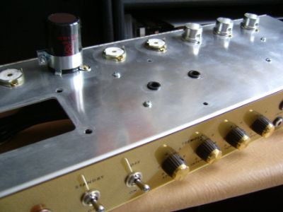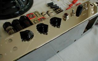 Das Chassis aus Stahl, verchromt mit allen Bohrungen und mit Siebdruckbeschriftung kann man bei Hoffmann bekommen. Pilotanzeige Knöpfe, Schalter habe ich vom Tube Amp Doc.