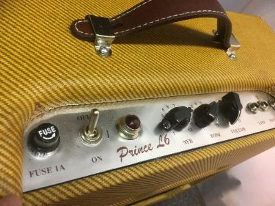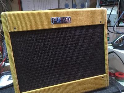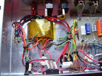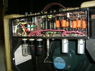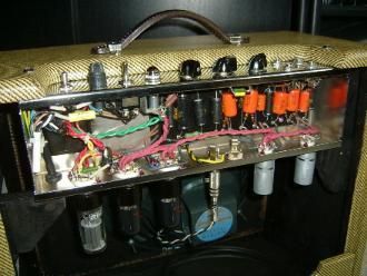 Als alter Röhrenfanatiker konnte ich aber von den heißen Dingern doch nicht ganz lassen. Ich wollte zum Anfang der Amps zurückzukehren und einen "neuen alten Amp" bauen. Ein Deluxe 1959: Class A, 6V6-Power, 5YGT3-Rectifiere 5E3-Schaltung, Jensen 12 ", Gottlob gibt es in den USA noch Fa. die Ersatzteile oder nach alten Plänen neu aufgelegte Bauteile (Trafos) herstellen. Das Gehäuse habe ich aus Birkensperrholz gebaut und dann mit dem originalen Tweed bespannt . Die Schaltung hat kleine Verbesserungen erhalten. Jede der 4 Input-Buchsen hat eine andere Gain u. Klangeinstellung. Geheizt wird mit Gleichspannung. Heraus kam mein neuer Lieblingsamp,iIdeal fürs Studio und Wohnzimmer mit dem alten Sound.