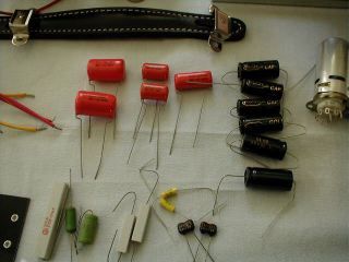 Die bestklingendsten Condensatoren: Sprague OrangeDrop Silver Mica Caps Ruby Audio Elkos sowie die Carbon-Widerstände sorgen u.a. für den Vintage Ton. Keramiksockel mit Goldkontakten sowie orig. Vintage-Ledergriff.
