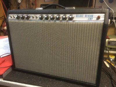 Deluxe Reverb alte SF-Front- platte, TAD-Kit mit HighGain- Mod und Bias- Vibrato -Mod. "Two in One"- Amp: brit. HighGain + Fender Clean mit A/B-Box anwählbar. Das übliche optoelektr. Vibrato wurde durch ein Bias-Vibr. ersetzt. Nun ist er ein nahezu optimales Arbeitsgerät.